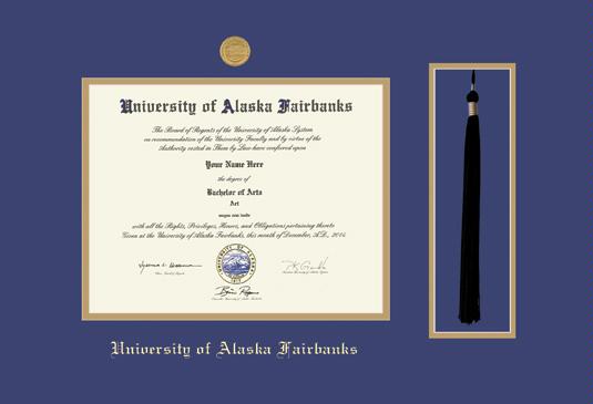 University of Alaska Fairbanks Diploma Frame with Medallion and Tassel Cut-out and Royal Blue and Gold Double Mat and Gold Embossing