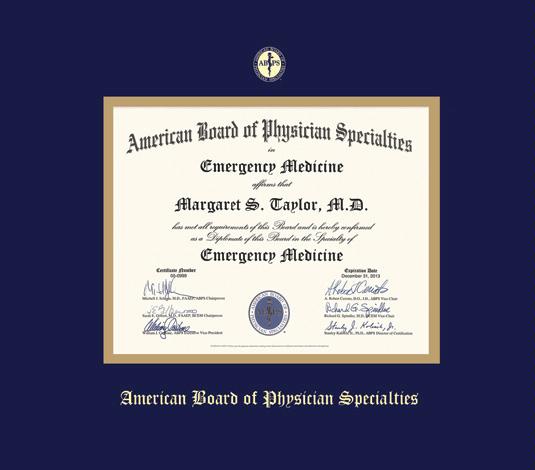 American Board of Physician Specialties Certificate Frame with Navy Blue and Gold Double Mat and Gold Embossing