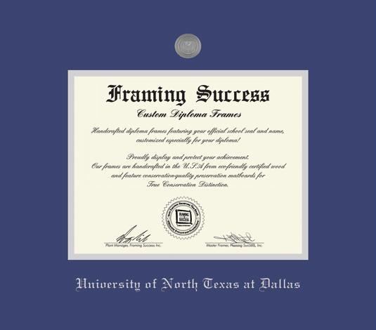 University of North Texas at Dallas Diploma Frame with Medallion and Royal Blue and Silver Double Mat and Silver Embossing