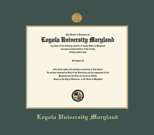 Loyola University Maryland Diploma (9/09 to Present) with Medallion Frame Featuring a Green and Gold Double Mat with Gold Embossing