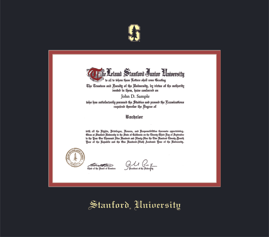 Stanford University Diploma with wordmark seal Frame with Black and Red Double Mat and Gold Embossing