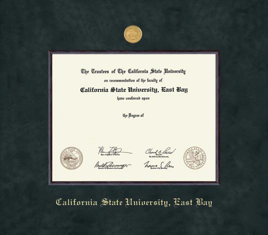 California State University, Hayward/East Bay Diploma - East Bay Frame with Medallion and Black Suede and Wood Fillet Double Mat and Gold Embossing