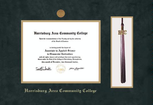 Harrisburg Area Community College Diploma Frame with Medallion and Tassel Cut-out and Black Suede and Gold Double Mat and Gold Embossing
