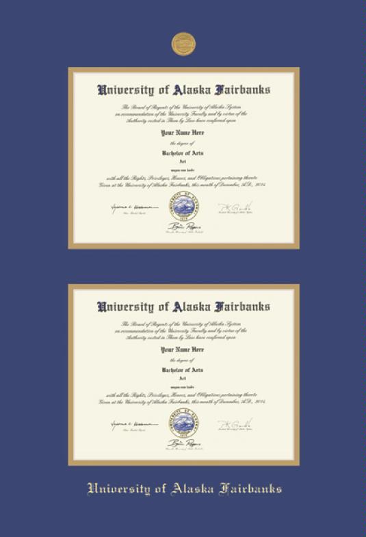 University of Alaska Fairbanks Double Diploma Frame with Medallion and Royal Blue and Gold Double Mat and Gold Embossing