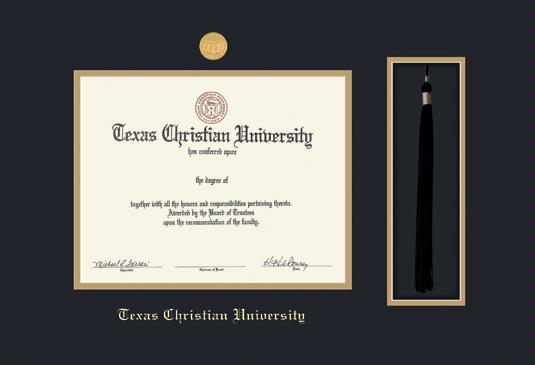Texas Christian University Diploma Frame with Medallion and Tassel Cut-out and Black and Gold Double Mat and Gold Embossing