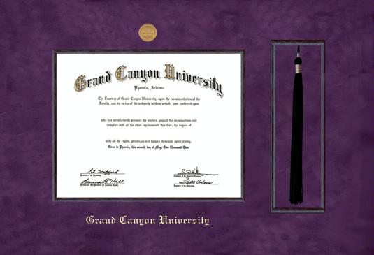 Grand Canyon University Diploma - BA/MA (7/16 to Present) Frame with Medallion and Tassel Cut-out and Purple Suede and Wood Fillet Double Mat and Gold Embossing