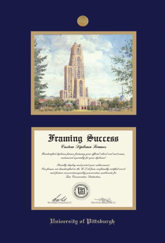 University of Pittsburgh Diploma (8.5 x 11) (1/16 to Present) and Litho Frame with Medallion and Navy Blue and Gold Double Mat and Gold Embossing