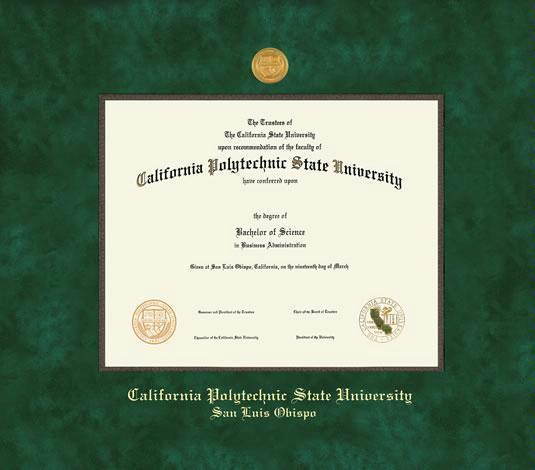 California Polytechnic State University - San Luis Obispo Diploma (12/01 to Present) Frame with Medallion and Green Suede and Wood Fillet Double Mat and Gold Embossing