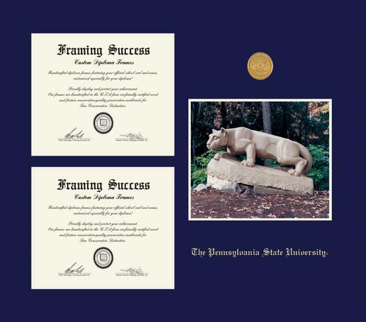 Pennsylvania State University Double Diploma with Nittany Lion Frame with Medallion and Navy Blue and Cream Double Mat and Gold Embossing