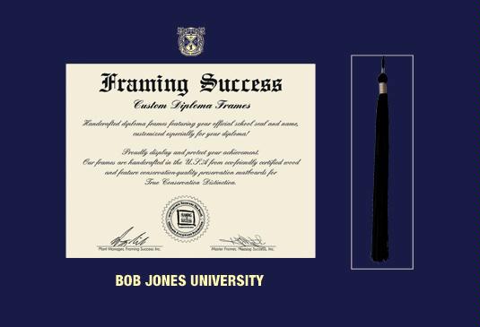 Bob Jones University Diploma (7/17 to Present) Frame with Tassel Cut-out and Navy Blue Mat and Gold Embossing