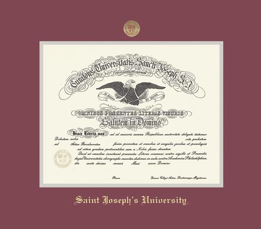 Saint Joseph's University Diploma Frame with Enameled Medallion and Maroon and Gray Double Mat and Gold Embossing