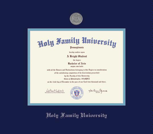 Holy Family University Diploma Frame with Medallion and Navy Blue and Sky Blue Double Mat and Silver Embossing