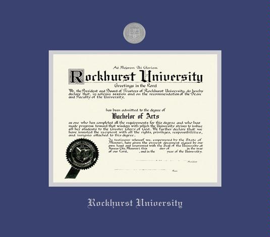 Rockhurst University Diploma (2018 to Present) Frame with Medallion and Royal Blue and Silver Double Mat and Silver Embossing