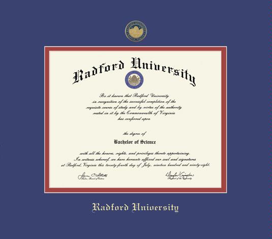 Radford University Diploma Frame with Colored Medallion and Royal Blue and Red Double Mat and Gold Embossing