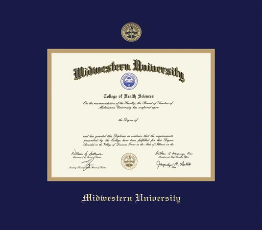 Midwestern University Diploma Frame with Medallion and Navy Blue and Gold Double Mat and Gold Embossing