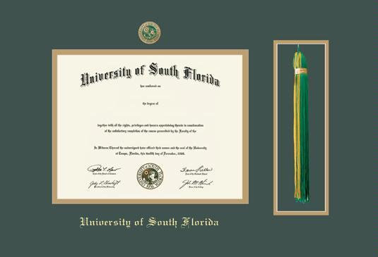 University of South Florida Diploma - MA (11x14)/PhD Frame with Enameled Medallion and Tassel Cut-out and Green and Gold Double Mat and Gold Embossing