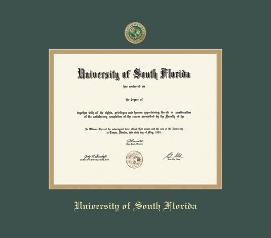 University of South Florida Diploma - BA Frame with Enameled Medallion and Green and Gold Double Mat and Gold Embossing