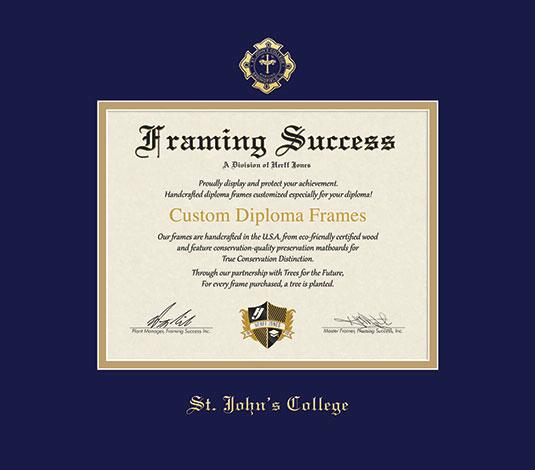 St. John's College Diploma Frame with Navy Blue and Gold Double Mat and Gold Embossing