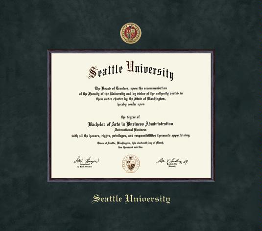 Seattle University Diploma - BA/MA Frame with Colored Medallion and Black Suede and Wood Fillet Double Mat and Gold Embossing