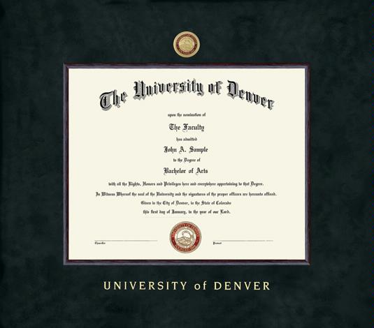University of Denver Diploma - Law/Upgrade BA/MA/MBA (Pre 7/25) Frame with Enameled Medallion and Black Suede and Wood Fillet Double Mat and Gold Embossing