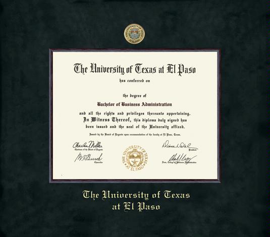 The University of Texas-El Paso Diploma Frame with Enameled Medallion and Black Suede and Wood Fillet Double Mat and Gold Embossing