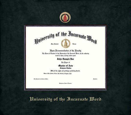 University of the Incarnate Word Diploma Frame with Enameled Medallion and Black Suede and Wood Fillet Double Mat and Gold Embossing