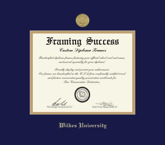 Wilkes University Diploma Frame with Medallion and Navy Blue and Gold Double Mat and Gold Embossing