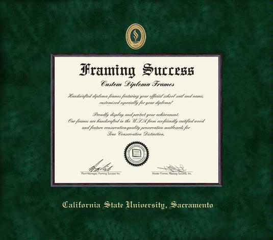 California State University, Sacramento Diploma Frame with Enameled Medallion and Green Suede and Wood Fillet Double Mat and Gold Embossing