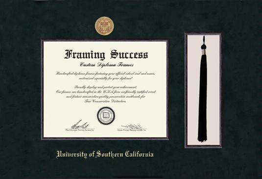 University of Southern California Diploma - BA/MA/PhD Frame with Colored Medallion and Tassel Cut-out and Black Suede and Wood Fillet Double Mat and Gold Embossing