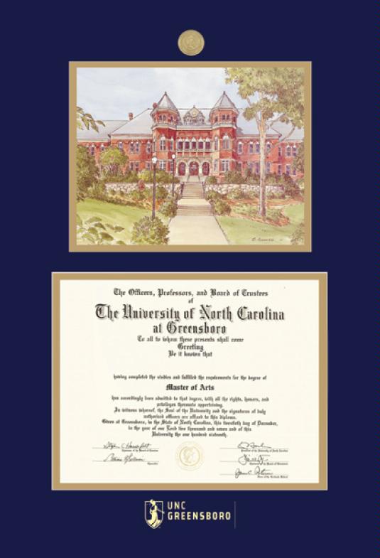 University of North Carolina at Greensboro Diploma - BA (2019 to Present) and Litho Frame with Medallion and Navy Blue and Gold Double Mat and Gold Embossing
