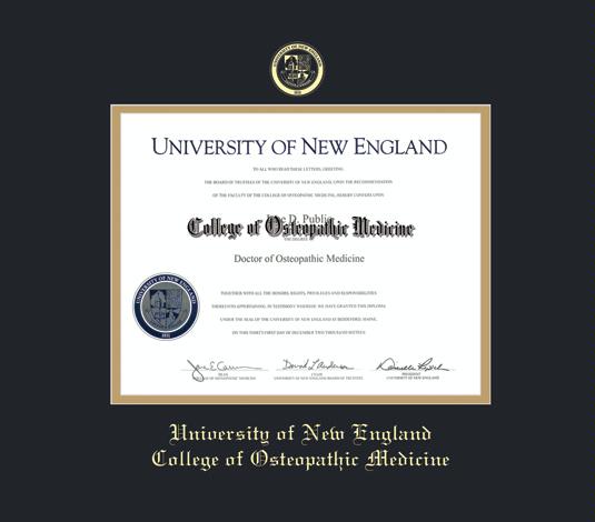University of New England Diploma - Osteopathic Medicine (2019 to Present) Frame with Black and Gold Double Mat and Gold Embossing