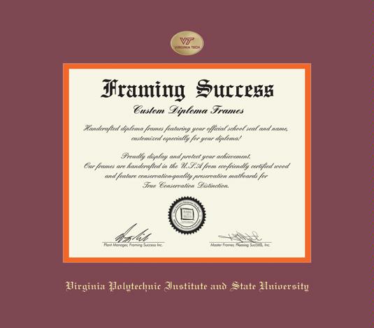 Virginia Polytechnic Institute & State University Diploma - (Pre 2024) MA/PhD (Except Biomedical Engineering) Frame with Wordmark Medallion and Maroon and Orange Double Mat and Gold Embossing