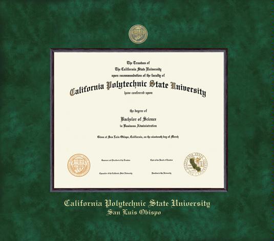 California Polytechnic State University - San Luis Obispo Diploma Frame with Medallion and Green Suede and Wood Fillet Double Mat and Gold Embossing
