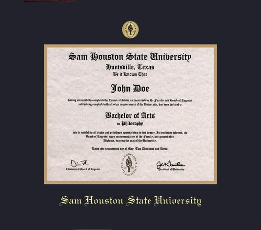 Sam Houston State University Diploma Frame with Colored Medallion and Black and Gold Double Mat and Gold Embossing