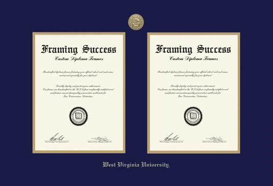 West Virginia University- Downtown Campus Double Diploma - BA/MA (6/19 to Present) Frame with Medallion and Navy Blue and Gold Double Mat and Gold Embossing