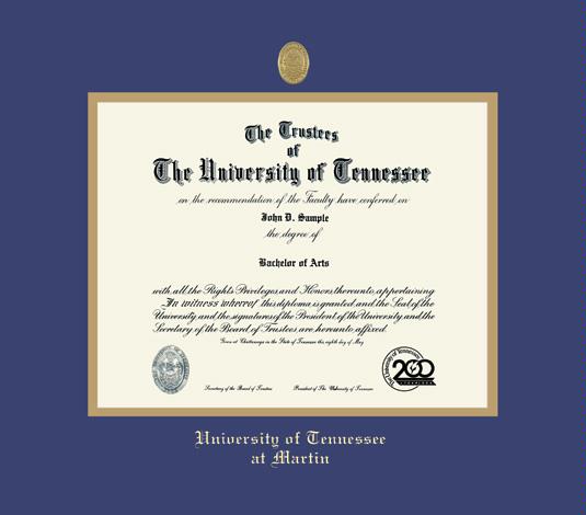University of Tennessee at Martin Diploma (Pre 8/22) Frame with Medallion and Royal Blue and Gold Double Mat and Gold Embossing