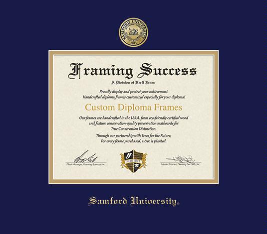 Samford University Diploma - PhD Frame with Colored Medallion and Navy Blue and Gold Double Mat and Gold Embossing