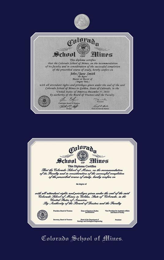 Colorado School of Mines Double Diploma - Paper and BA Metal Frame with Medallion and Navy Blue and Gray Double Mat and Silver Embossing
