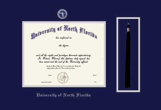 University of North Florida Diploma - BA (2020 to Present) Frame with Medallion and Tassel Cut-out and Navy Blue and Silver Double Mat and Silver Embossing