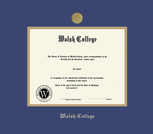 Walsh College Diploma - MA (2000 to Present) Frame with Medallion and Royal Blue and Gold Double Mat and Gold Embossing