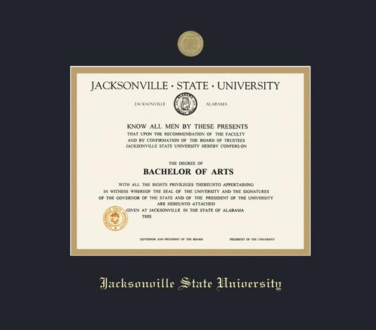 Jacksonville State University Diploma Frame with Medallion and Black and Gold Double Mat and Gold Embossing