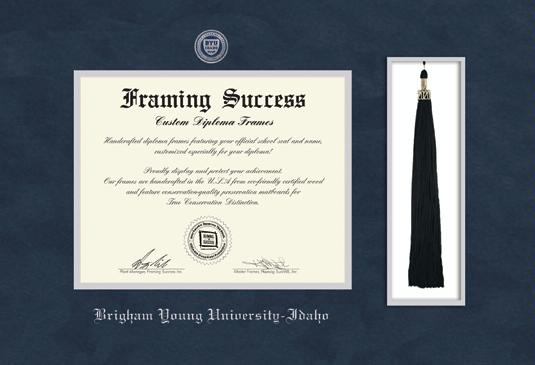Brigham Young University - Idaho Diploma Frame with Medallion and Tassel Cut-out and Navy Blue and Silver Double Mat and Silver Embossing