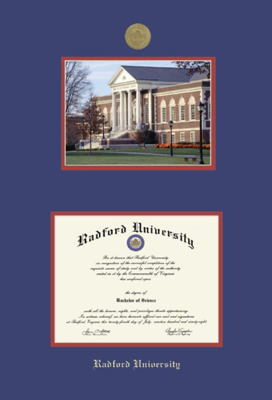 Radford University Diploma and Photo Frame with Gold Medallion and Royal Blue and Red Double Mat and Gold Embossing
