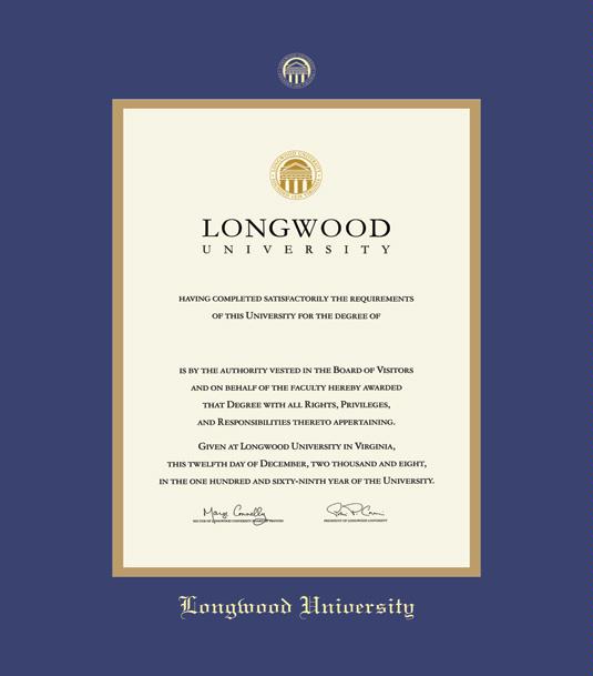 Longwood University Diploma (2020 to Present) Frame with Royal Blue and Gold Double Mat and Gold Embossing