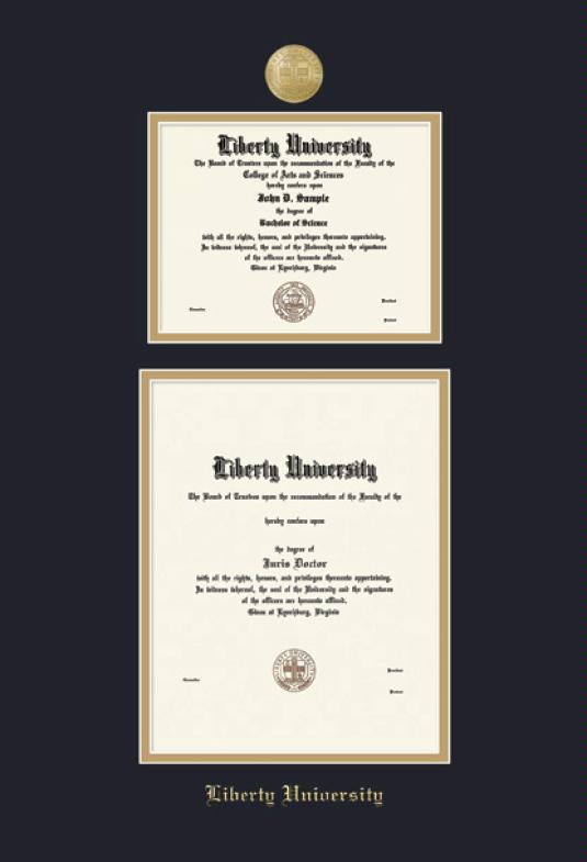 Liberty University Double Diploma - BA and MA/PhD (8/16 to Present) Frame with Gold Medallion and Black and Gold Double Mat and Gold Embossing