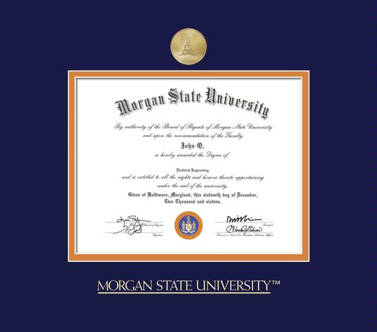 Morgan State University Diploma - BA/MA Frame with Gold Medallion and Navy Blue and Orange Double Mat and Gold Embossing