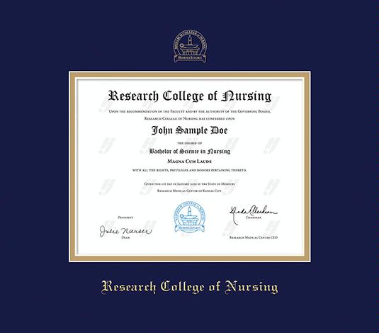 Research College of Nursing Diploma Frame with Navy Blue and Gold Double Mat and Gold Embossing