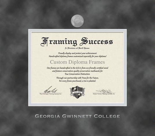 Georgia Gwinnett College Diploma Frame with Medallion and Grey Suede and Silver Double Mat and Silver Embossing