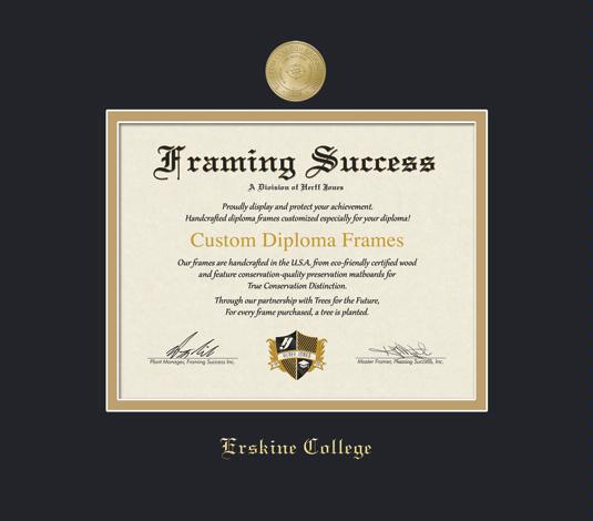Erskine College Diploma Frame with Medallion and Black and Gold Double Mat and Gold Embossing