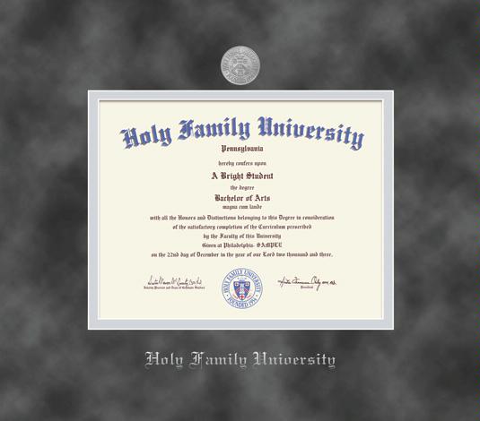 Holy Family University Diploma Frame with Medallion and Grey Suede and Silver Double Mat and Silver Embossing